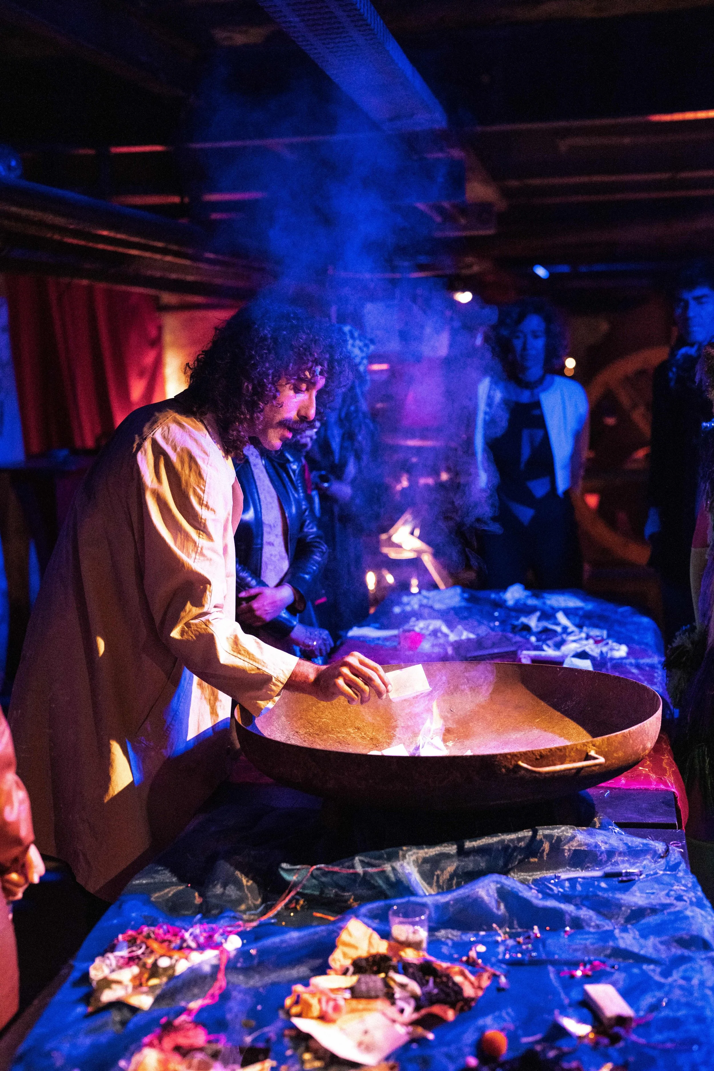 Through a carefully choreographed performative ritual, participants move through five phases — from initiation and a collective offering ritual to the shared reconstruction of a dream that grows sideways rather than forward. Guided by archetypal figures — The Guide and The Dreamkeeper — the experience weaves together storytelling, embodied presence, fire, sound, object work, and collective creation.
